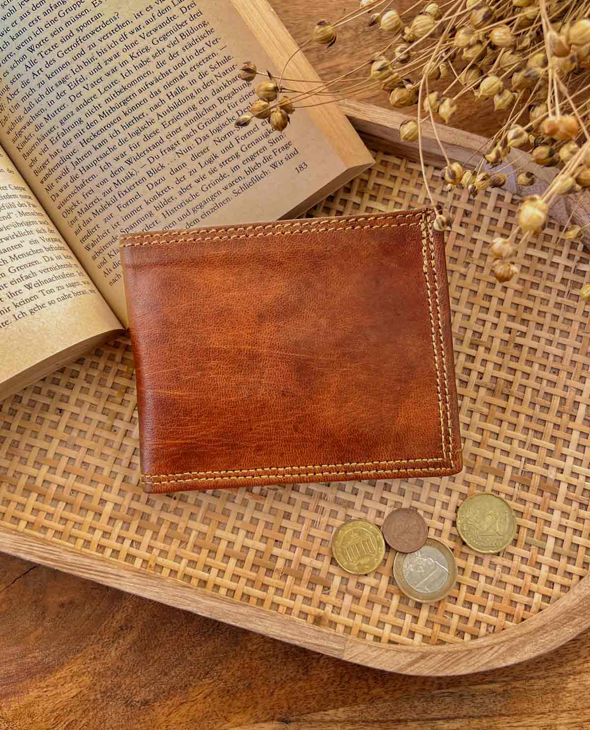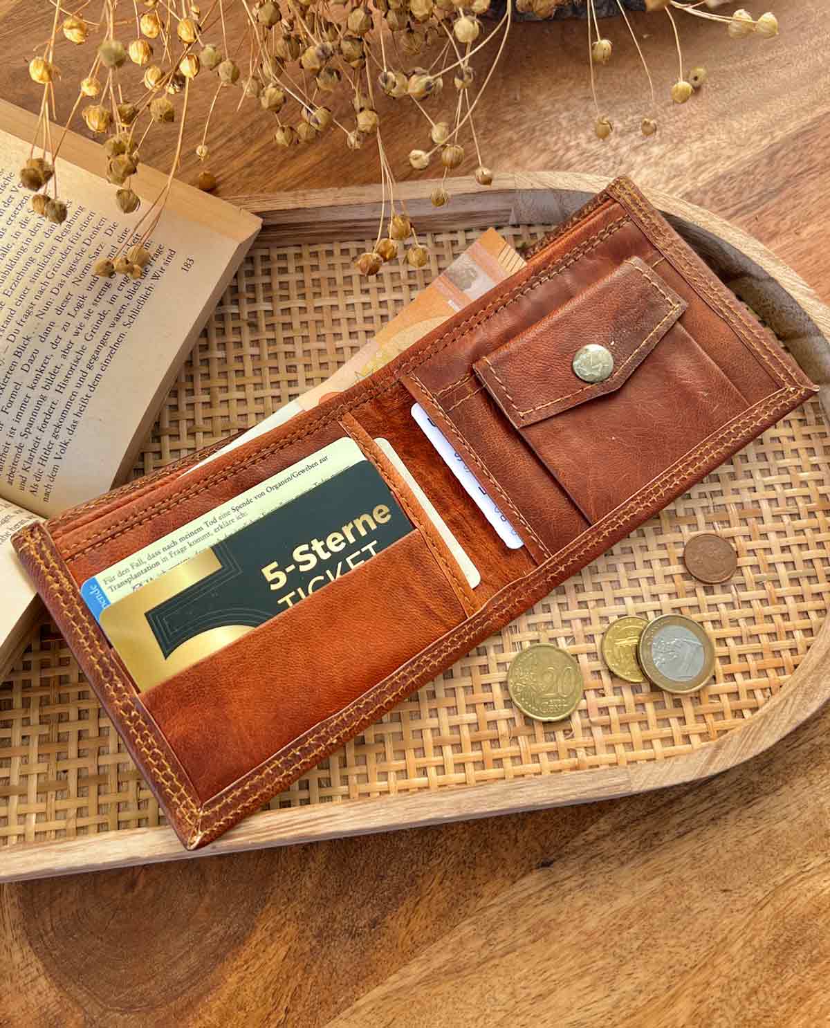 Einfach nur schön! Mit diesem Wort kann man „Joey“ am besten beschreiben. Die Geldbörse verzaubert mit seinem flexiblen und weichen, naturgegerbten Ziegenleder. Schlichtes Vintage-Design trifft auf Natürlichkeit. Ziernähte verleihen dem Design das gewisse Etwas und lassen das Portemonnaie zum Liebhaberstück werden. Mit einer einfachen Klapptechnik lässt sich die Geldbörse schließen. Im Inneren stehen Dir drei Kartenfächer zur Verfügung. Zwei Steckfächer ermöglichen es Dir, weitere Karten sicher unterzubringen. Natürlich ist ebenfalls ein kleines Fach für Dein Kleingeld, abgesichert durch einen Druckknopf, und ein großes, langgestrecktes Fach für Deine Geldscheine vorhanden. Die handliche und praktische Größe lässt es in jede Tasche passen.