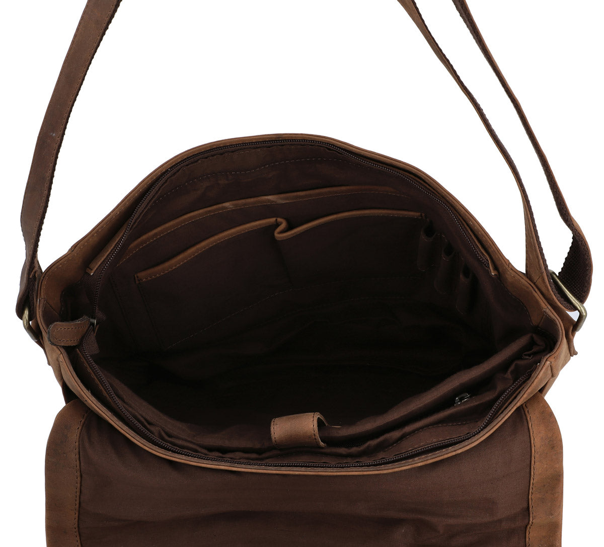 Unsere Umhängetasche ist aus hochwertigem, robustem Leder gefertigt. Das strapazierfähige Material gewinnt mit der Zeit an Charakter und entwickelt eine einzigartige Patina. Jede Tasche ist handgefertigt und besitzt ihre eigenen individuellen Merkmale, wodurch sie zu einem einzigartigen Unikat wird. Die braune Farbe verleiht der Tasche einen authentischen Vintage-Look, der zu jedem Outfit perfekt passt. Zudem bietet die Tasche ausreichend Stauraum: Das Hauptfach ist groß genug für ein Tablet, ein Notebook oder wichtige Unterlagen. Zwei Innenfächer und eine Reißverschlusstasche sorgen für Ordnung, während der verstellbare Schultergurt für optimalen Tragekomfort sorgt – ob lässig über der Schulter oder quer über den Körper getragen.