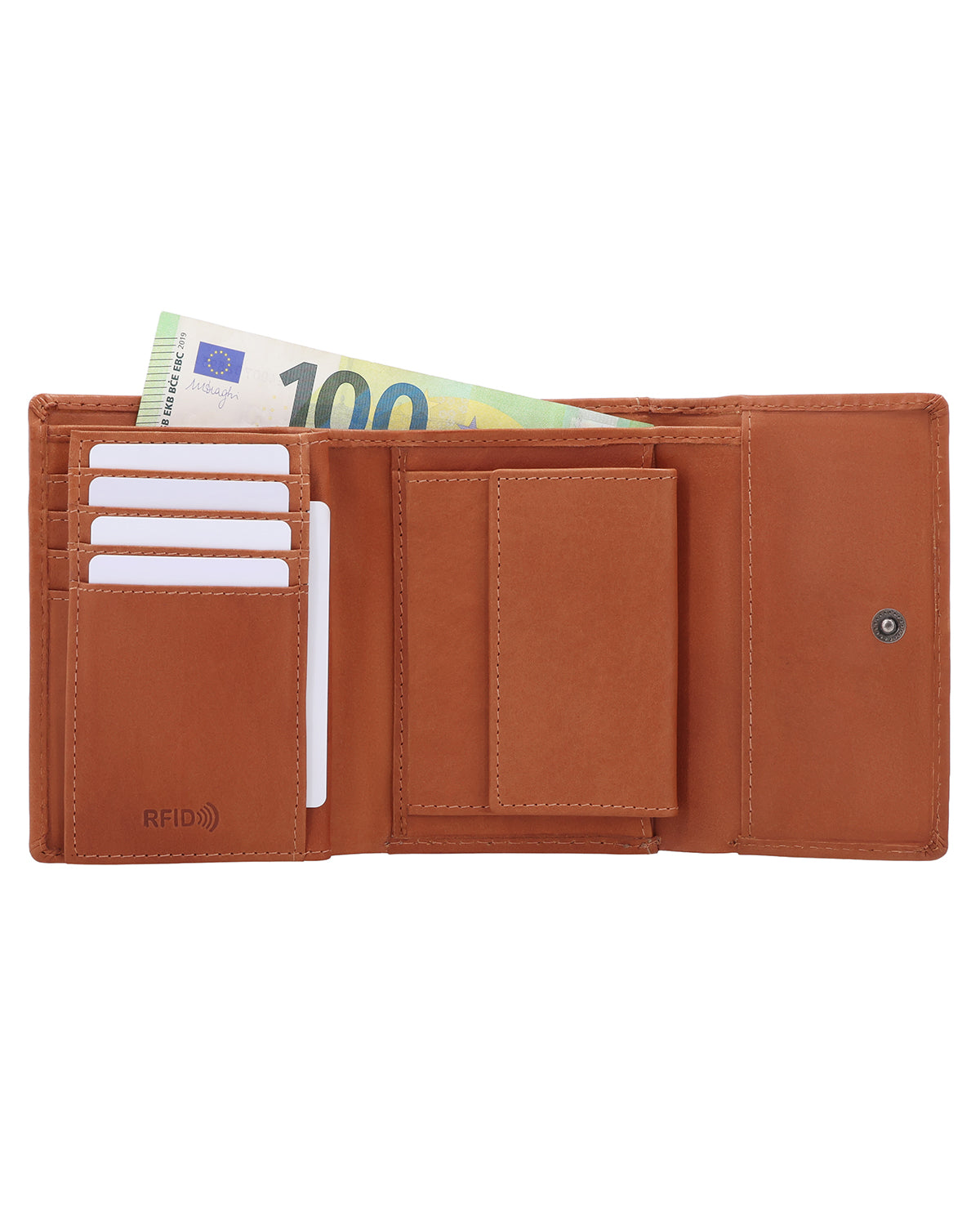 Mit "Tessa" ist schnelles Verstauen von Rückgeld an der Kasse kein Problem mehr. Immerhin dauert es ja meistens schon lange genug, bis die Einkäufe eingepackt sind. Ob du nun lieber mit Karte oder bar bezahlst: alles ist schnell griffbereit und ebenso schnell wieder im Portemonnaie verschwunden. Unsere Geldbörse besteht aus robustem Rindsleder und kann mit einem Druckknopf verschlossen werden. Dank integriertem RFID-Schutz sind deine Karten dabei zusätzlich vor ungewolltem Auslesen geschützt. Für den kleinen Alltagsmoment gibt es außerdem ein extra Münzfach für eine einzelne Münze – perfekt, wenn du schnell eine passende Münze griffbereit haben möchtest. Das Logo ist außen geprägt und verleiht "Tessa" einen noch hochwertigeren, cleanen Look. Auf der Rückseite befindet sich sogar noch ein zusätzliches Fach für zum Beispiel Fahrkarten, so brauchst du auch in der Bahn nicht lange zu suchen, wenn der Schaffner auf Kontrollgang ist. Außerdem findest du dein Ticket direkt und die Zeiten des "Hilfe, ich habe mein Ticket verloren"-Gedankens sind endlich Teil der Vergangenheit!