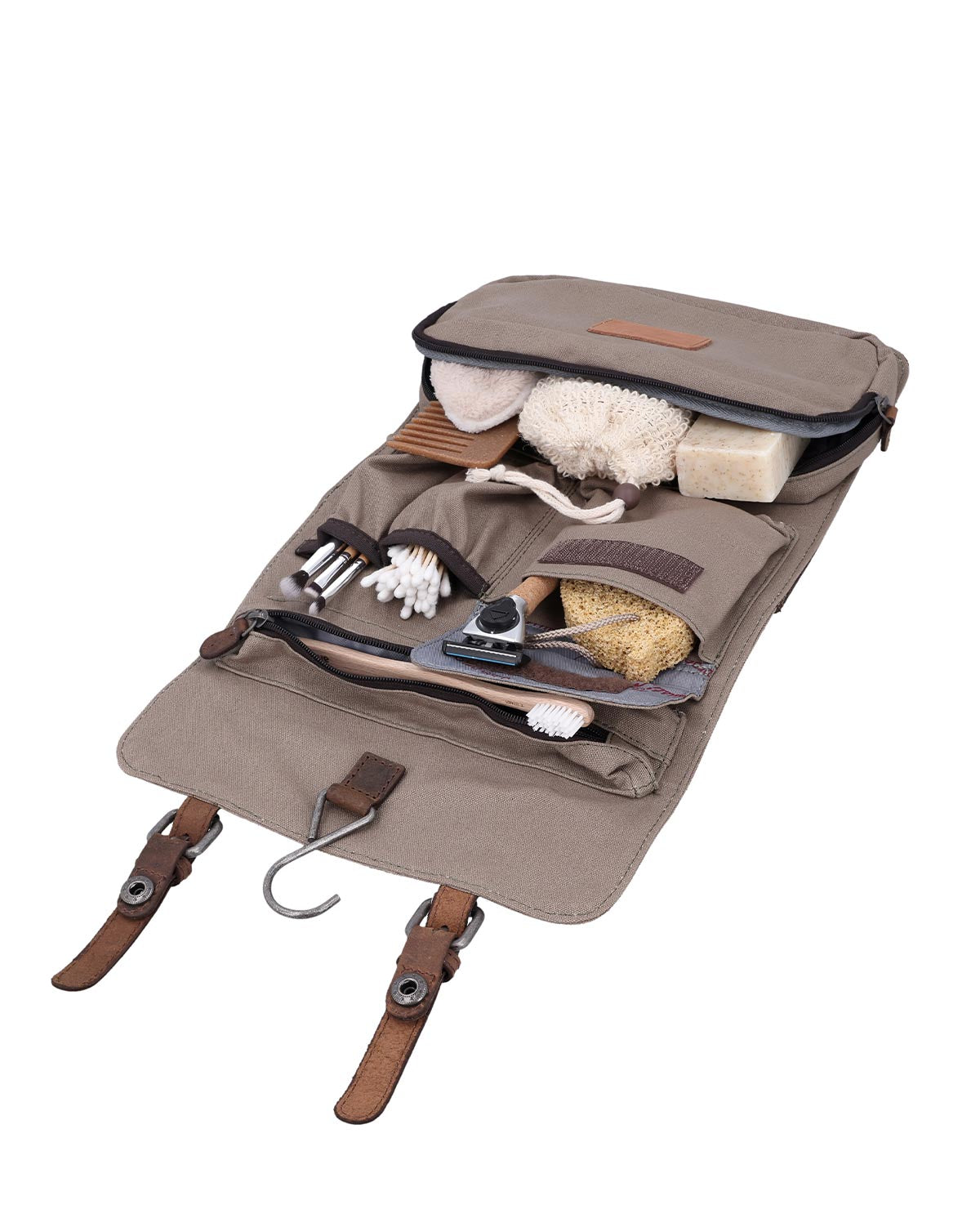 Einmal aufgeklappt, staunst Du: "Rodney" wurde an alles gedacht. Er besteht aus hochwertigem Materialmix aus Canvas-Webstoff und Büffelleder. Innen findest Du verschiedene Fächer für Zahnbürste, Shampoos, Bürste, Rasierzubehör, Kosmetik und mehr. Der wasserfeste Innenstoff aus Polycotton schützt vor kleinen Malheuren durch ausgelaufene Shampooflaschen. Der stabile Metallhaken erlaubt ein kinderleichtes Aufhängen an der Wand. Verstellbare Schnallen und Druckknöpfe vollenden das Design – "Rodney" ist ein echter Sorglosmacher!