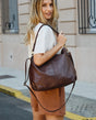 Du suchst nach einem einem klassische Shopper, der dich nicht im Regen stehen lässt? Dann ist "Hannah" genau dein Fall. Diese mittelgroße Umhängetasche besteht aus robustem und widerstandsfähige Rindsleder die in einem muted dunkelbraun daherkommt. So liegst du voll im Trend und hast dennoch durch ihre geräumiges Innenfach genug Plat für alles, was Du auf einem Bummel durch die Stadt oder im Berufsalltag gebrauchen könntest.