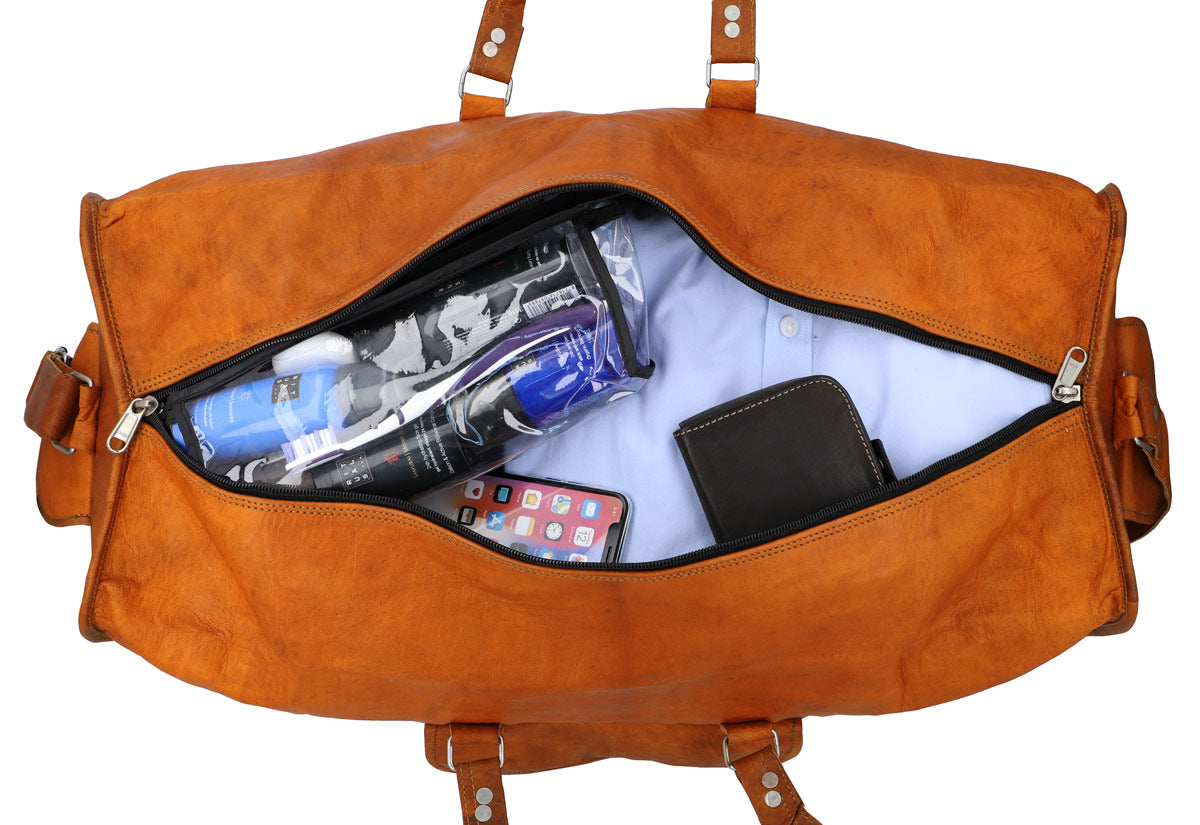 Die geräumige Reisetasche aus vegetabil gegerbtem Ziegenleder besticht nämlich nicht nur durch das klassische Vintage-Design, sondern überzeugt obendrein mit einem hohen Tragekomfort und Platz ohne Ende. So passen Deine Kleidung und zwei Paar Schuhe ebenso problemlos in das Hauptfach der Tasche wie Dein Kulturbeutel, Dein Lieblingsschmöker oder auch Dein Notebook oder der eine oder andere Aktenordner. Ein zusätzliches Reißverschluss-Innenfach bietet Dir darüber hinaus die Möglichkeit, Deine wertvolleren Habseligkeiten wie Reisedokumente, Portemonnaie, Smartphone etc. sicher zu verwahren. Auf der Vorderseite findet sich außerdem ein großes aufgesetztes Außenfach und an den Seitenflächen je ein kleines, in denen Du Dinge wie Bonbons, Proviant, Gameboy, Taschentücher, eine kleine Notfall-Apotheke u.v.m. verstauen kannst. Die verwendeten Dornschnallenverschlüsse verleihen Oscar dabei diesen besonderen Vintage-Charme, der sofort begeistert. Das große Hauptfach der Tasche schließt unterdessen mit einem Reißverschluss, damit unterwegs auch wirklich nichts verloren gehen kann.
