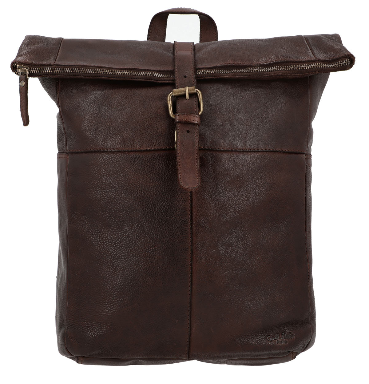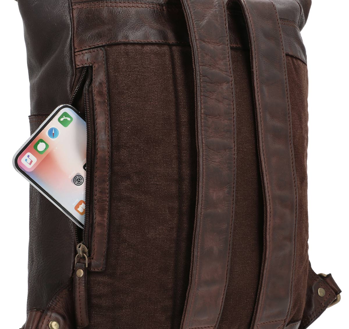 "Henning" ist ein mittelgroßer Rolltop-Rucksack aus widerstandsfähigem Rindsleder, der durch seinen schmalen Schnitt geradezu dafür gemacht ist, um im Großstadtgewirr oder der Enge der S-Bahn zur Rush Hour abzuliefern. Durch seine durchdachte Aufteilung bietet er Dir nämlich ausreichend Raum, um ohne Weiteres Deine DIN A4-Unterlagen, das 15"-Notebook, eine ganze Hand voll Bücher und eine große Trinkflasche im geräumigen Hauptfach zu verstauen, während Dir ein zusätzliches Steckfach sowie ein Reißverschluss-Innenfach dabei helden, Deine Habe mit System zu strukturieren, sodass alles seinen festen Platz findet. Das seitliche Reißverschlussfach außen bietet Dir derweil Platz für all die Dinge, die Du immer mal wieder zwischendurch benötigst, während die gepolsterte Rückenpartie wie auch die Innenseite der breiten Schulterriemen mit braunem Canvas bespannt sind und Dir so eine Extraportion Tragekomfort bieten.