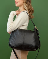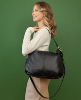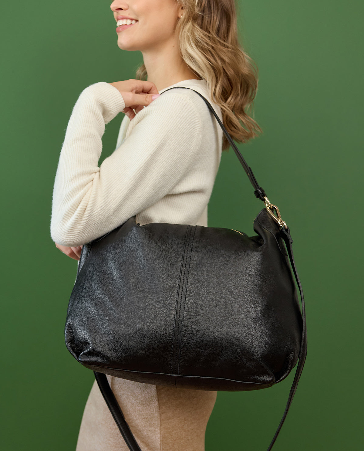 Du suchst einen klassischen Shopper, der Dich nicht im Regen stehen lässt? Dann ist „Hannah“ genau die Richtige für Dich. Diese mittelgroße Umhängetasche besteht aus robustem und widerstandsfähigem Büffelleder in elegantem Schwarz. So liegst Du voll im Trend und hast dennoch durch das geräumige Innenfach genug Platz für alles, was Du bei einem Stadtbummel oder im Berufsalltag brauchst. Inspiriert vom urbanen Berliner Großstadt Flair vereint „Hannah“ Stil und Funktionalität.
