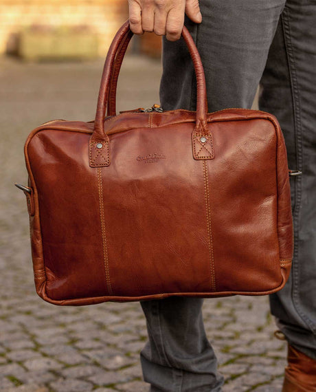 - A leather briefcase for the office is a perfect choice. Briefcases made of smooth leather have a classic, elegant look, while models with a brushed surface have a rougher finish.