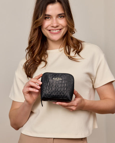 - With leather accessories such as a classic wallet, a fashionable purse and a cosmetic bag with a wipe-clean lining, you are equipped for every situation in your everyday life and prepared for all eventualities .