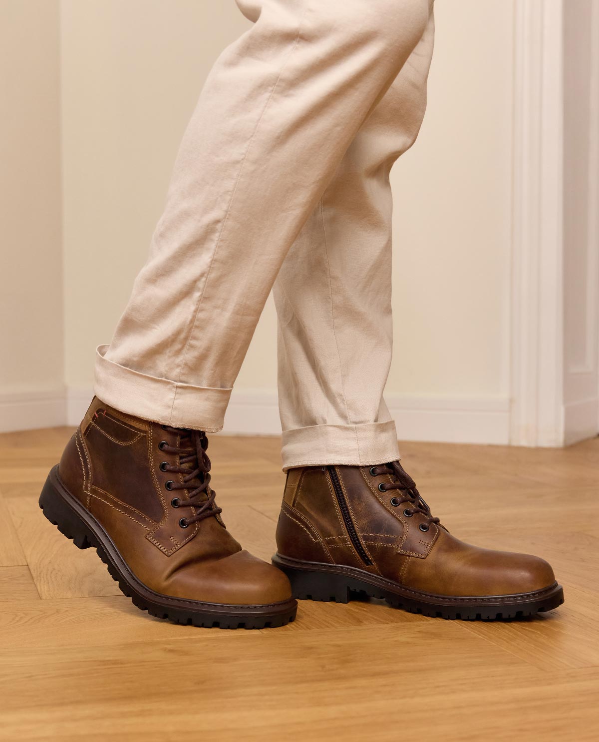 With "Oberon", you choose a pair of leather shoes that combines classic elegance with modern sophistication. Made from high-quality cowhide leather, these shoes impress with their smooth texture, durability, and elegant shine that suits any occasion. The classic lace-up design with eyelets allows for a personalized fit, while the side zipper enables quick on and off – a practical detail that combines comfort and functionality. The fine orange stitching at the ankle provides a stylish accent that subtly enhances the simple design.