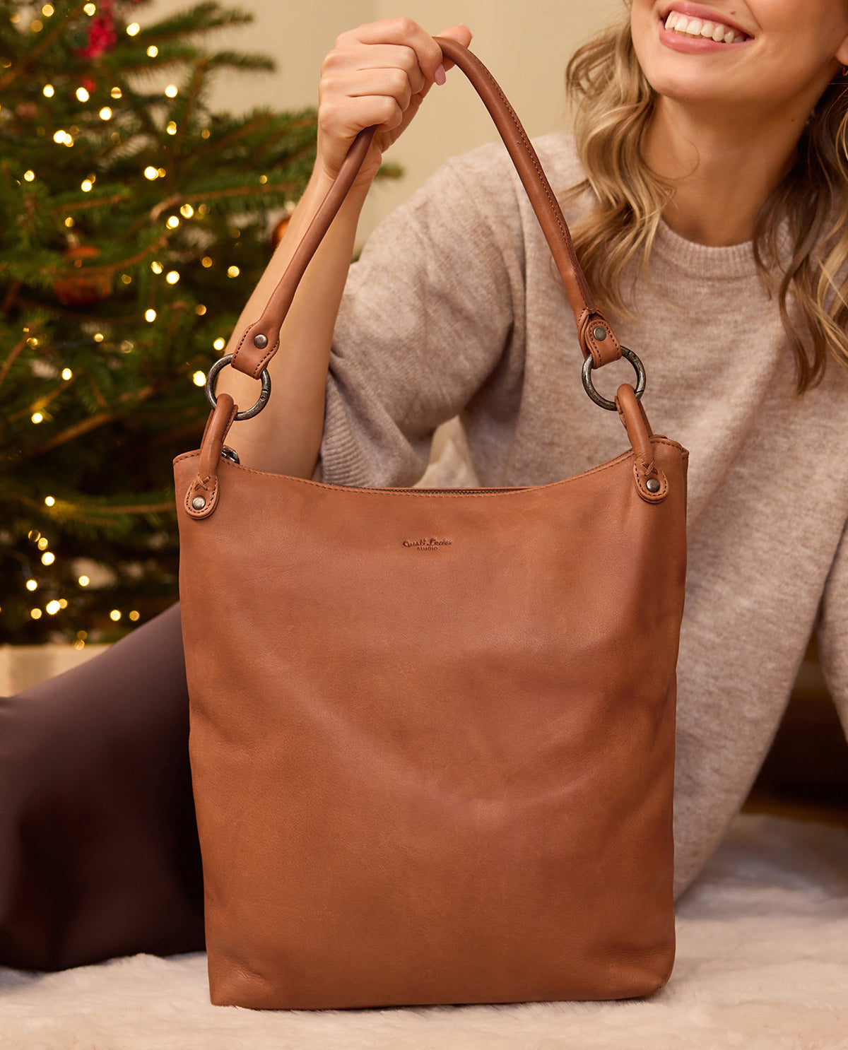 The "Cathy" Shopper is the perfect blend of practical functionality and elegant design. Made from high-quality brown leather, it impresses with robust, round handles reinforced with metal rings and featuring X-stitched leather detail. The zipper with leather pull ensures that your personal items are always safe and protected. The generous interior compartment, lined with durable cotton fabric, provides ample space for everything you need in daily life ben.