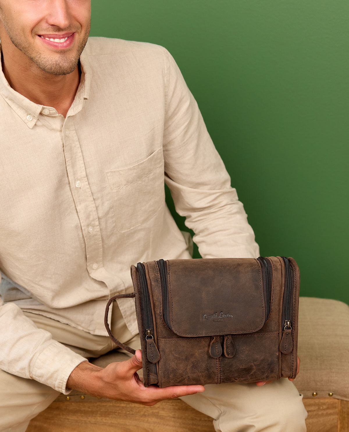 You could play hide-and-seek in this toiletry bag if you were an elf. Super spacious “Chester” has plenty of space for your toiletries. There are multiple pockets inside where you can organise your bathroom essentials. Use the two side pockets for things you need easy access to. Hang “Chester” up using the hanging loop while you’re using him. “Chester’s” lining is water-resistant, so no need to worry about small spillages. We’ve created a Gusti Leather toiletry bag that isn’t just functional, it’s super stylish too. Choose between a stylish brown or elegant black toiletry bag for your next trip away. What more could you want? You’ll never have to compromise in the bathroom again with our spacious toiletry bag “Chester”.