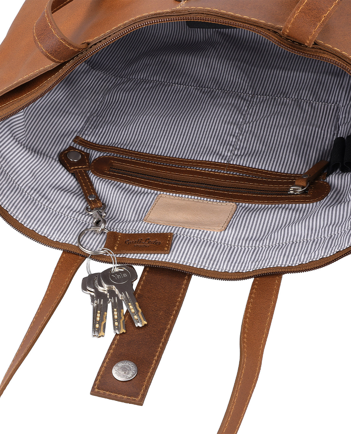 The practical interior compartments provide the option to easily store small items like your phone and keys and keep them within reach without having to rummage through the entire bag. "Alexandra" offers space for devices up to 15", folders, wallet, makeup, and shopping – simply everything you need. With its unique size and strong leather, it is not only a practical but also a stylish companion for every adventure the day holds.