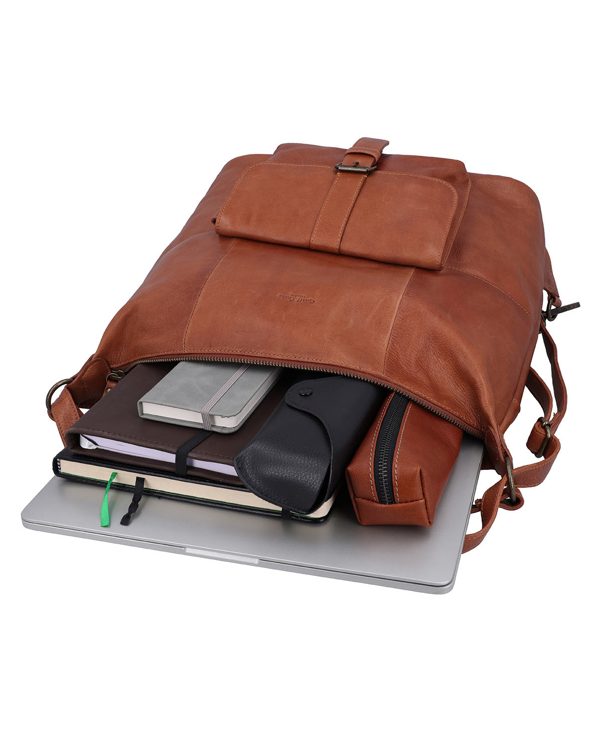 The "Armand" also offers clever storage options to keep your belongings safe and organized. In addition to the main compartment, the bag has a front pocket with a classic buckle closure and two inner compartments, one of which has a zipper for small valuables. Thanks to the two adjustable leather shoulder straps, you can carry the bag according to your preferences as a shoulder bag or backpack. Inside, there is also a practical engraving patch that adds a personal touch to your bag.