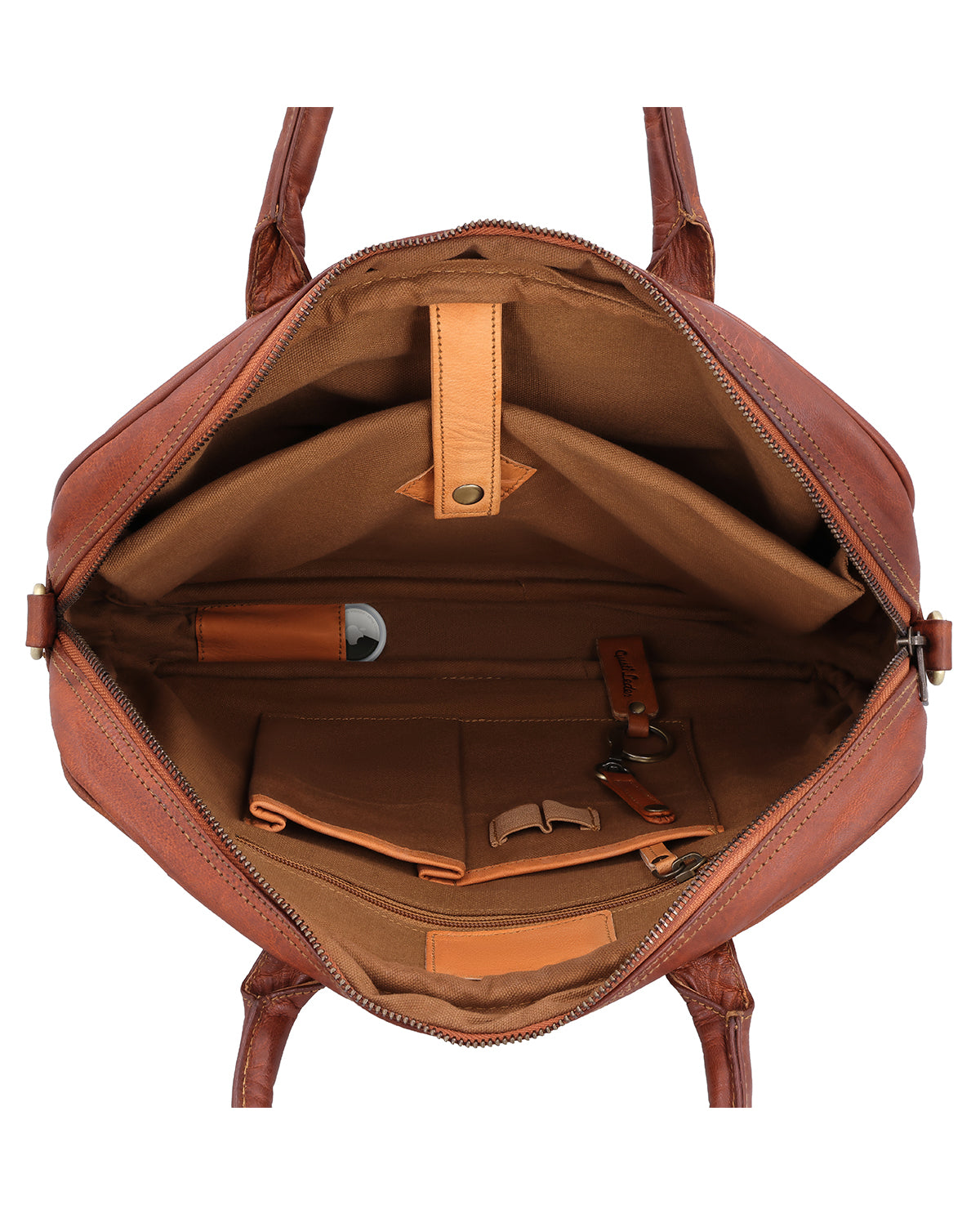 With "Cassius," you are choosing a briefcase that perfectly combines elegance, functionality, and comfort. Made from high-quality leather, it impresses with its clean lines and well-thought-out interior layout. The main compartment with zipper offers generous storage space, while the padded laptop compartment protects your computer. Inside, you will find two slip pockets, a zipper compartment, pen holders, and a removable key ring holder, so everything has its place. An integrated AirTag compartment ensures that you can always find your bag – ideal for your modern working life.