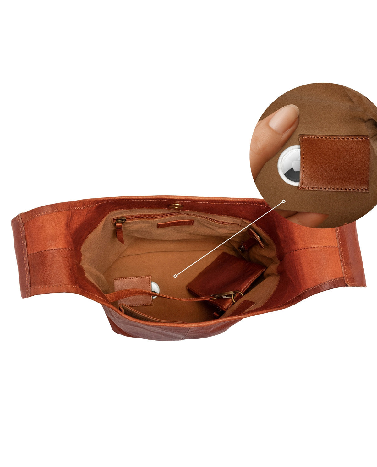 Shoulder bag with AirTag pocket and removable zip pouch