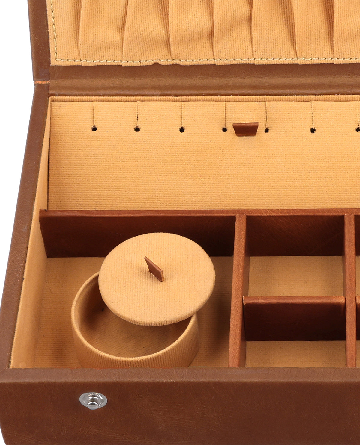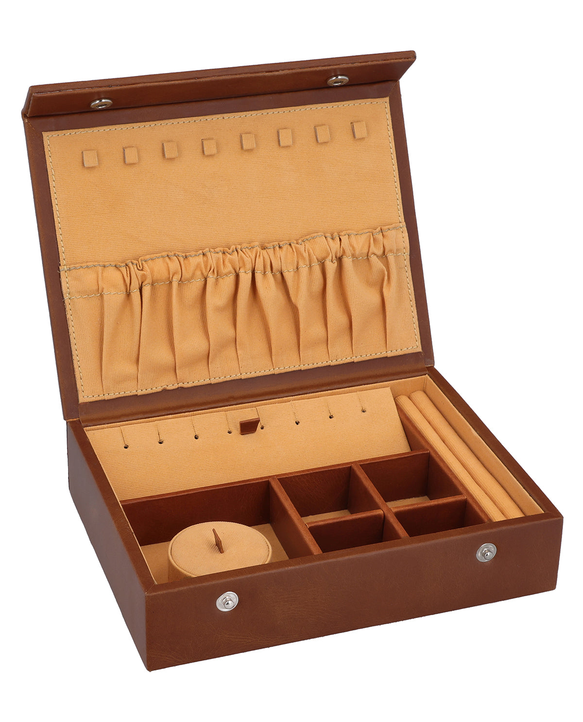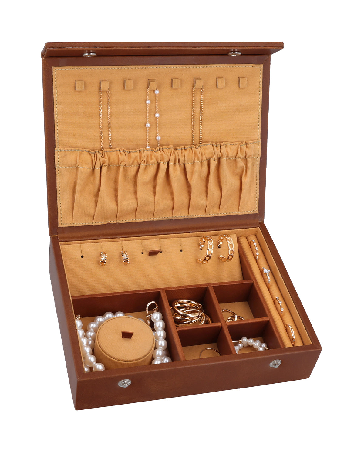 Inside, "Bine" impresses with cleverly designed features: Hooks for necklaces prevent tangling, while an elastic pocket safely stores delicate accessories. Padded ring inserts and divided compartments allow for clear organization of all your jewelry pieces. Thanks to the sturdy snap closure, everything stays securely stored - ideal for both home and travel. With "Bine" you keep your treasures stylishly, securely, and always within reach.