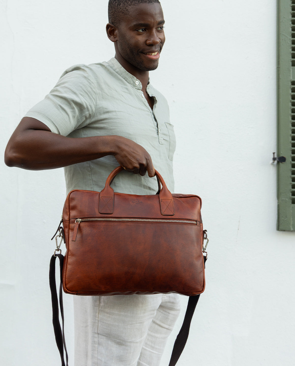 The adjustable and removable shoulder strap ensures that you can carry "Elijah" flexibly, while the padding on the shoulder strap noticeably increases comfort when you're on the go. Made from vegetable-tanned Cowhide leather, the bag impresses with its robust, durable quality that will reliably accompany you through your everyday life. The zippered outer pocket on the front provides a secure place for important small items such as your smartphone or wallet. And for a personal touch, an engraving patch is integrated – making "Elijah" a truly unique piece if you wish.