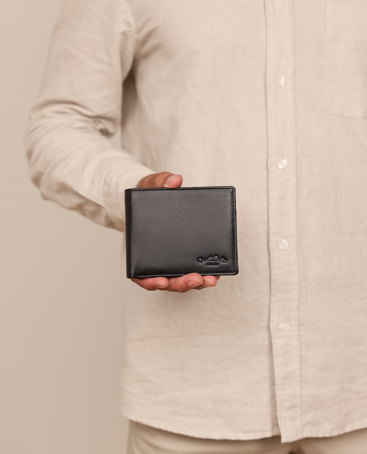 A smart, practical wallet needs a simple design: a coin pocket, a pocket for cash and receipts, some card slots, and an extra slot for your ID. Our classic men's wallet “Regis” is super stylish and super simple. This billfold wallet is made of sturdy cowhide leather and will win you over with its simplicity and practicality. “Regis” is small enough to fit in your jeans or jacket pocket, so you can always take your essentials with you when you're on the go. He's available in elegant black or casual brown, so you're sure to find what you're looking for.