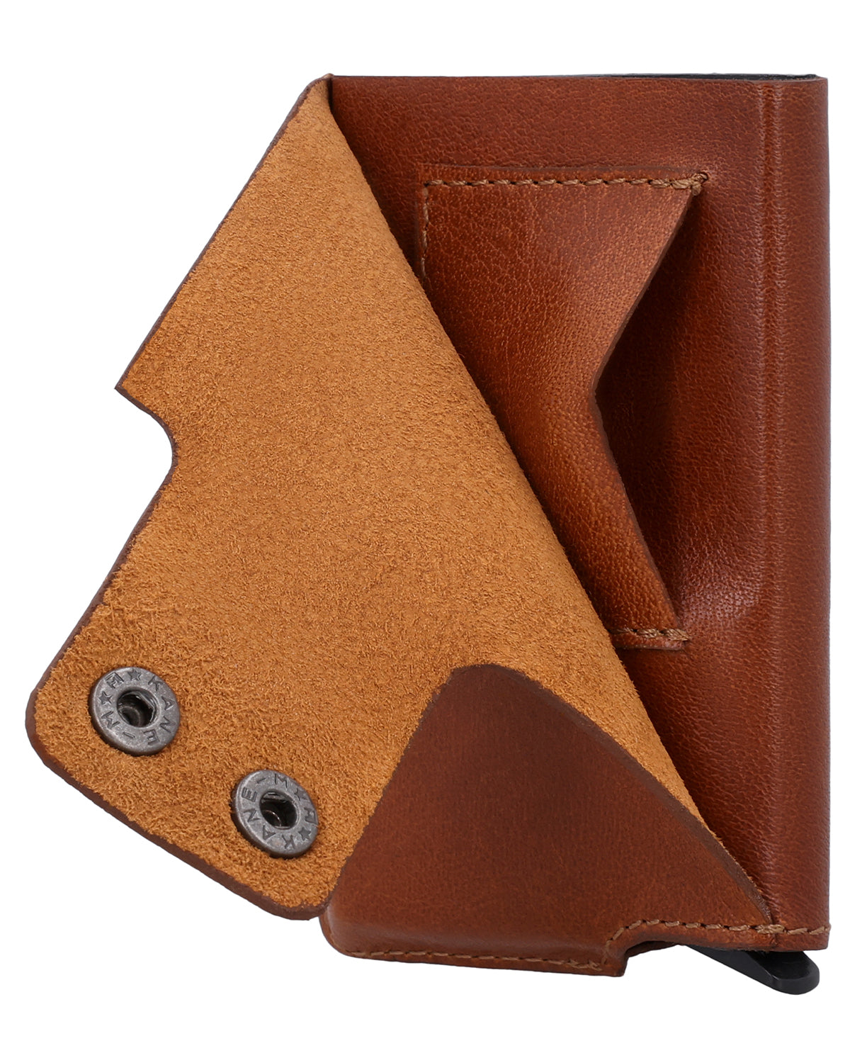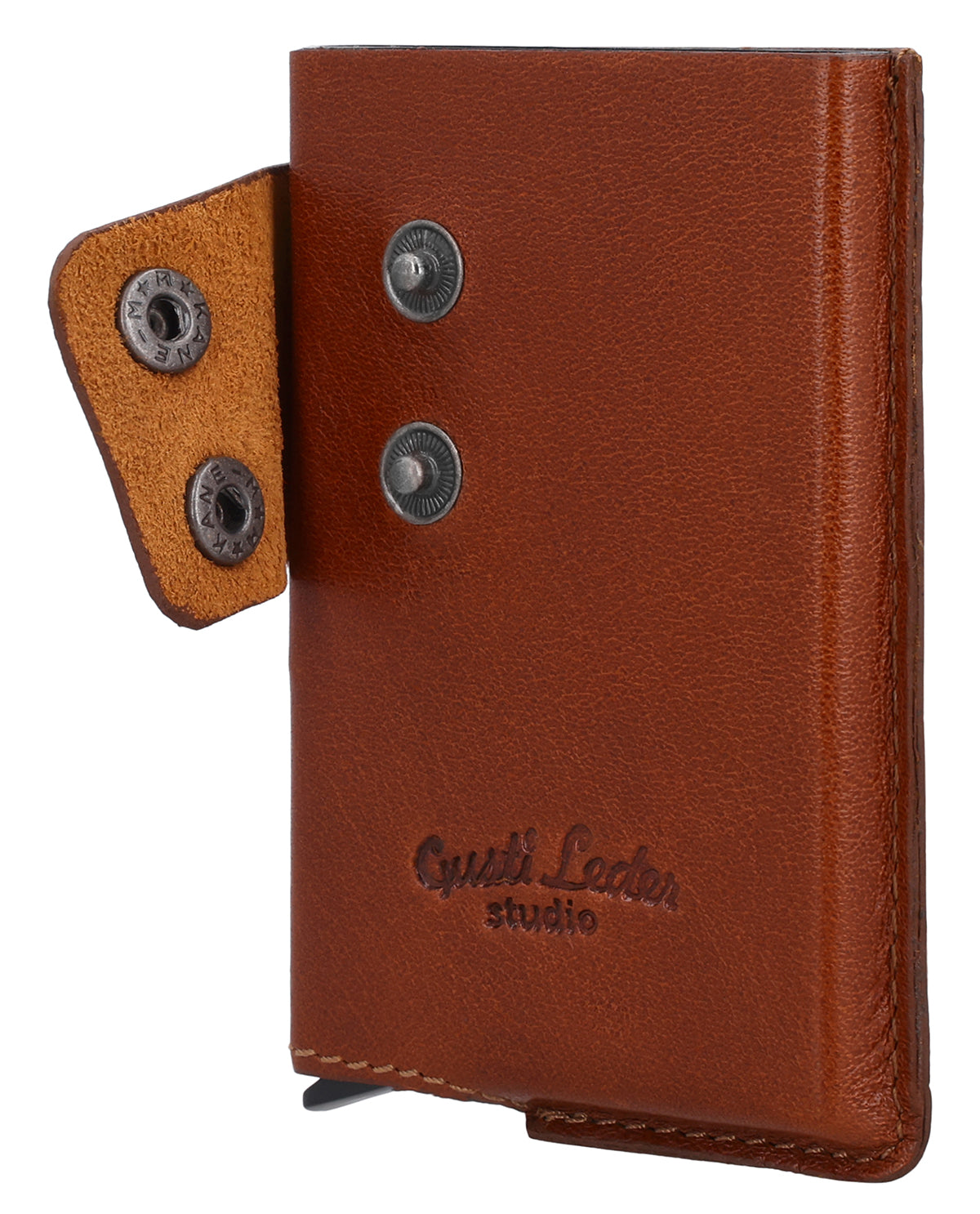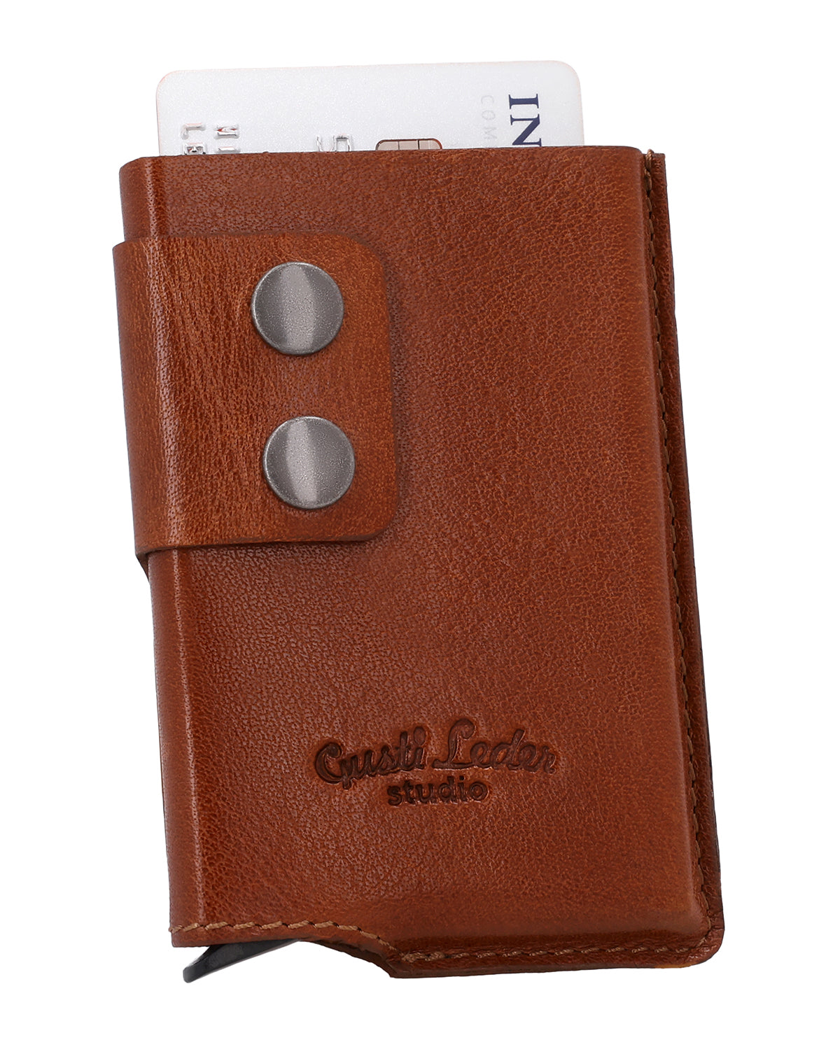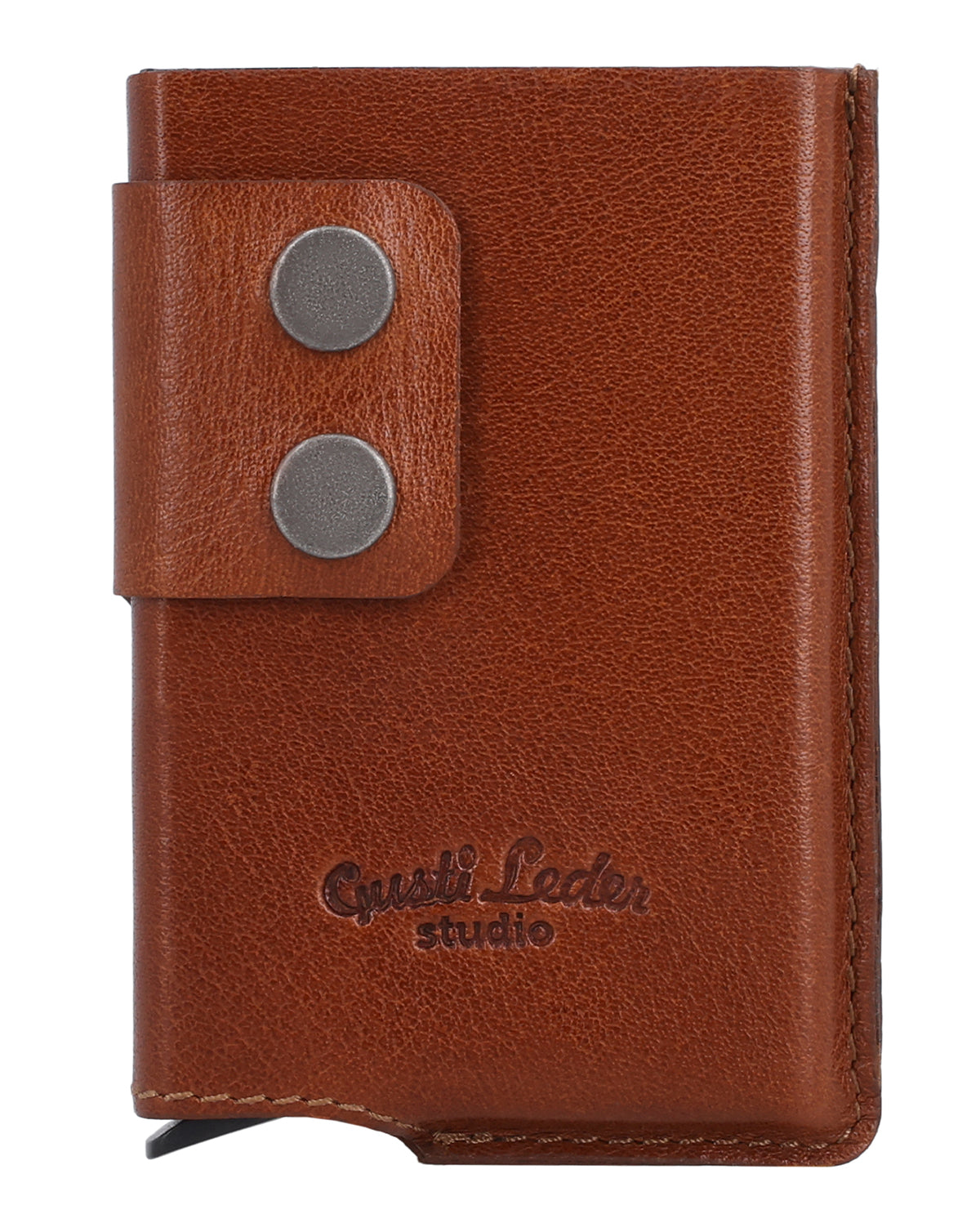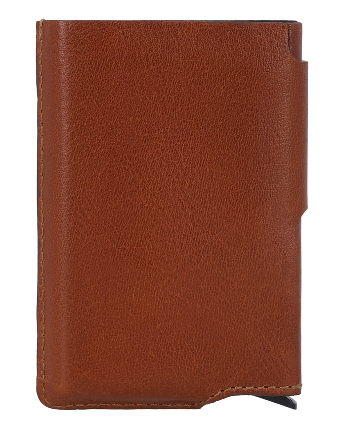 The brown "Tilo" wallet is a men's wallet that combines security and clear structure. Two snap fasteners ensure a secure hold and safe closure in everyday use. The integrated automatic pop-up mechanism brings your cards up clearly at the touch of a button and allows quick access. "Tilo" has a minimalist, functional design and fits easily into any pocket.