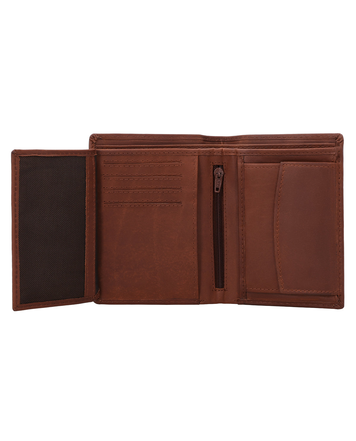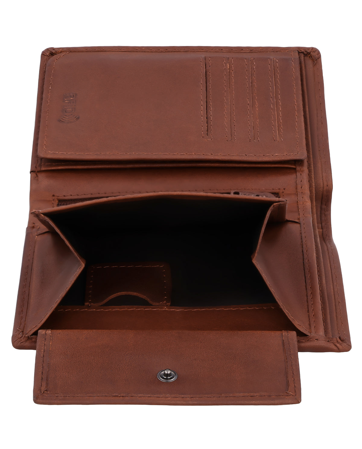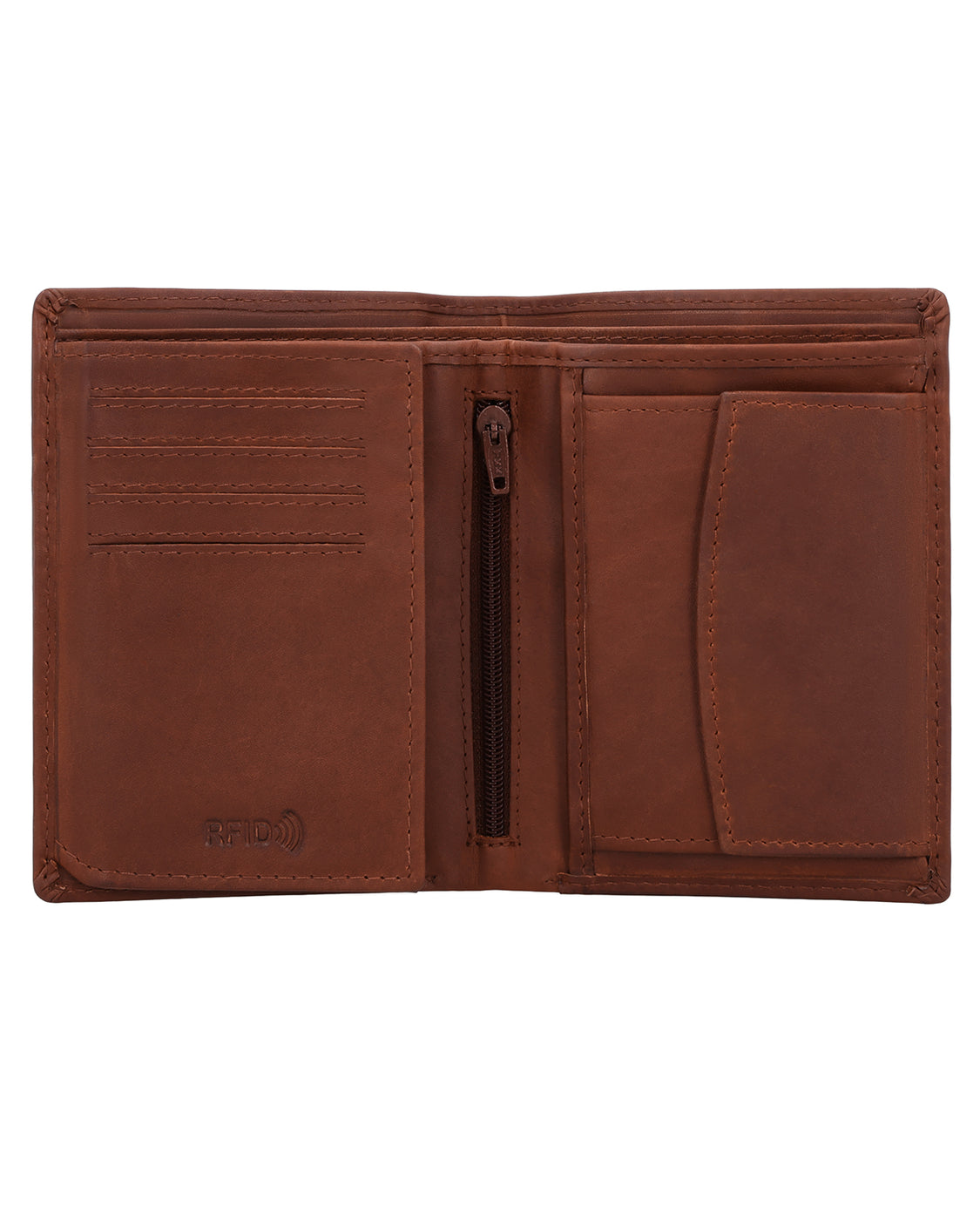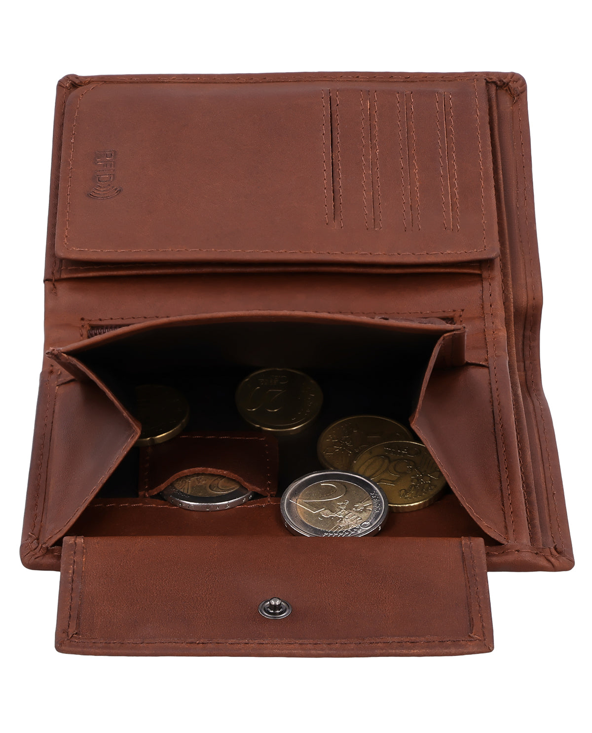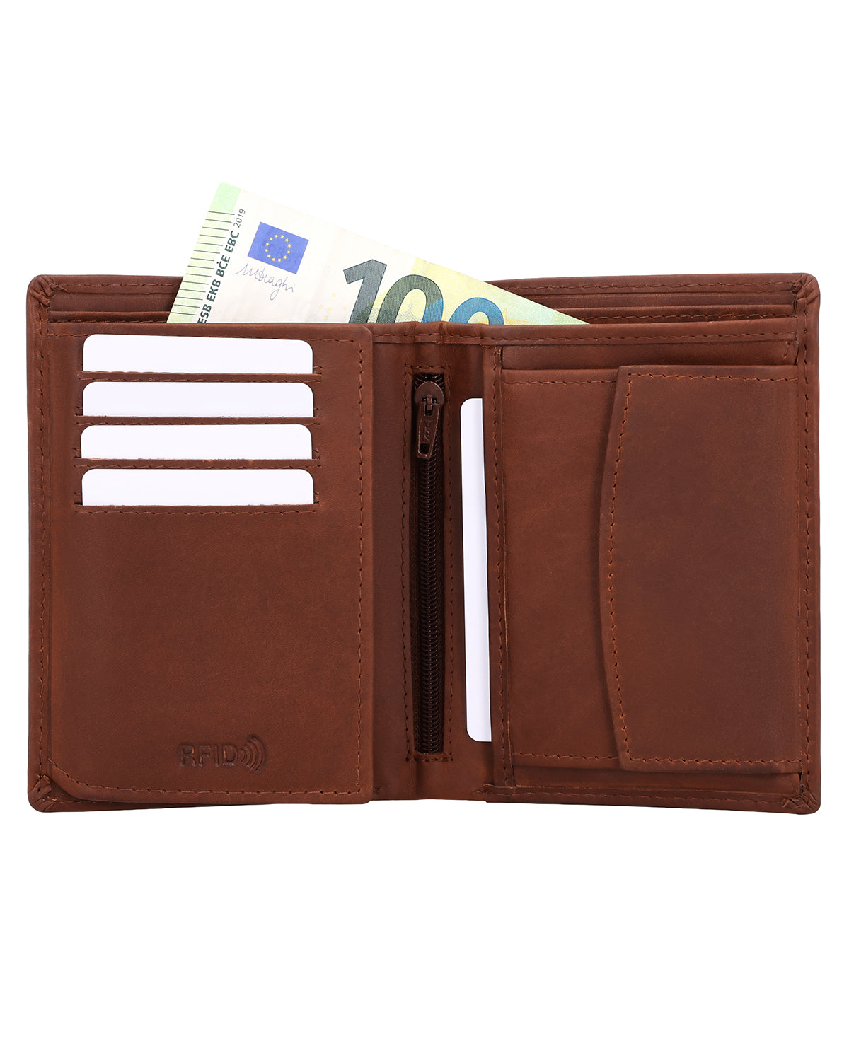 Im Inneren überrascht die Lederbörse dann trotz ihrer kompakten Form mit einer geräumigen und sehr übersichtlich strukturierten Aufteilung bestehend aus zwei Geldscheinfächern, einem separaten Münzfach, das über einen Druckknopf geöffnet werden kann, sowie 8 Steckfächern für (mindestens) ebenso viele Karten. Im Münzfach findest Du zudem ein extra Münzfach für eine 1-€-Münze, das sich ideal für Einkaufswagen oder Schließfächer eignet. Ein zusätzlich integriertes Flipfach erweitert die Börse noch um ein großes Sichtfenster, in dem problemlos Ausweis, Führerschein oder auch Fotos von Deinen Liebsten untergebracht werden können. Ein weiteres "Nice-to-have" ist das kleine Reißverschlussfach, in dem ganz besondere Wertsachen verstaut werden können, sowie die zwei seitlichen Einsteckfächer hinter den Münz- und Kartenfächern.