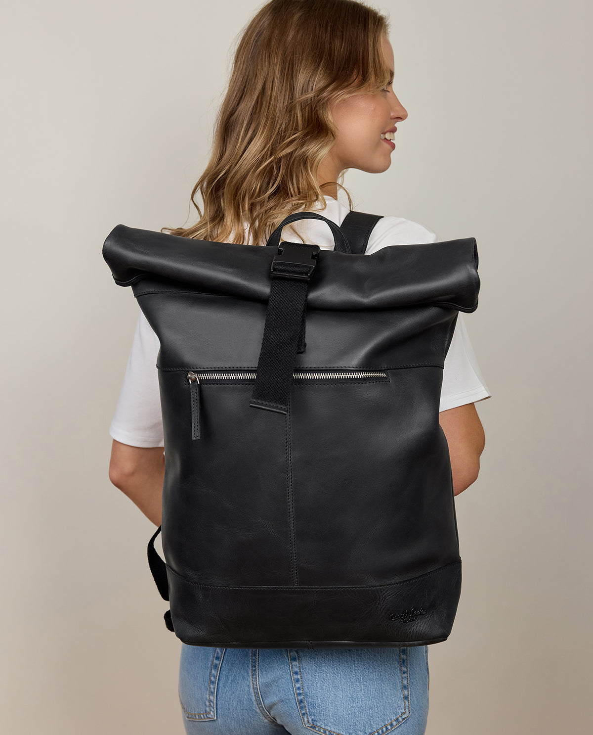 Ob für Schule, Uni oder Arbeit – unser Rolltop-Rucksack "Mattis" passt einfach immer. Denn er weiß mit seiner Flexibilität, seinem hohen Tragekomfort und Platzangebot zu überzeugen. Dieser klassisch-robuste Daypack aus schwarzem Büffelleder fällt dabei vor allem durch sein trendiges Rolltop auf – ein Look, an dem man momentan einfach nicht vorbeikommt.