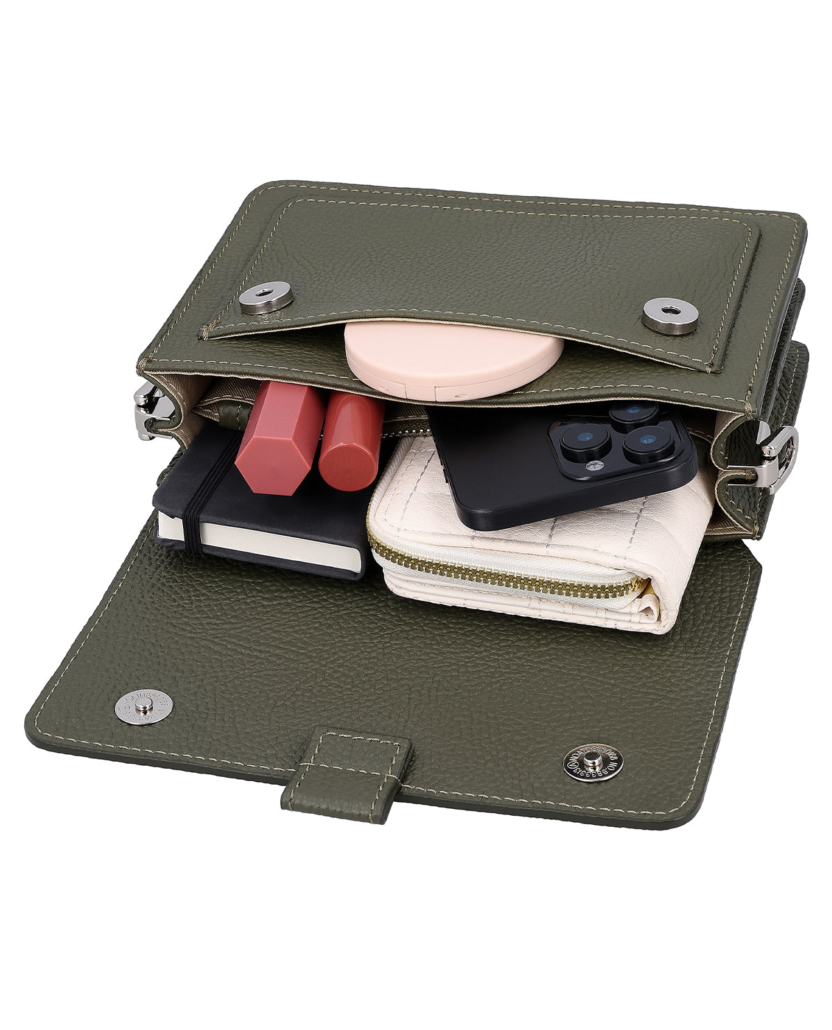Die Umhängetasche "Trude" vereint zeitlose Eleganz mit durchdachter Funktionalität und begleitet Dich zuverlässig durch Deinen Alltag. Gefertigt aus hochwertigem Leder und veredelt mit einem dezenten Made in Italy Logo, steht sie für Qualität und Stilbewusstsein. Die klare Silhouette mit magnetischer Überschlagklappe verleiht der Tasche eine ruhige, elegante Ausstrahlung. Dank des verstellbaren und abnehmbaren Ledertrageriemens kannst Du "Trude" flexibel über der Schulter oder crossbody tragen – ganz so, wie es zu Deinem Tag passt.
